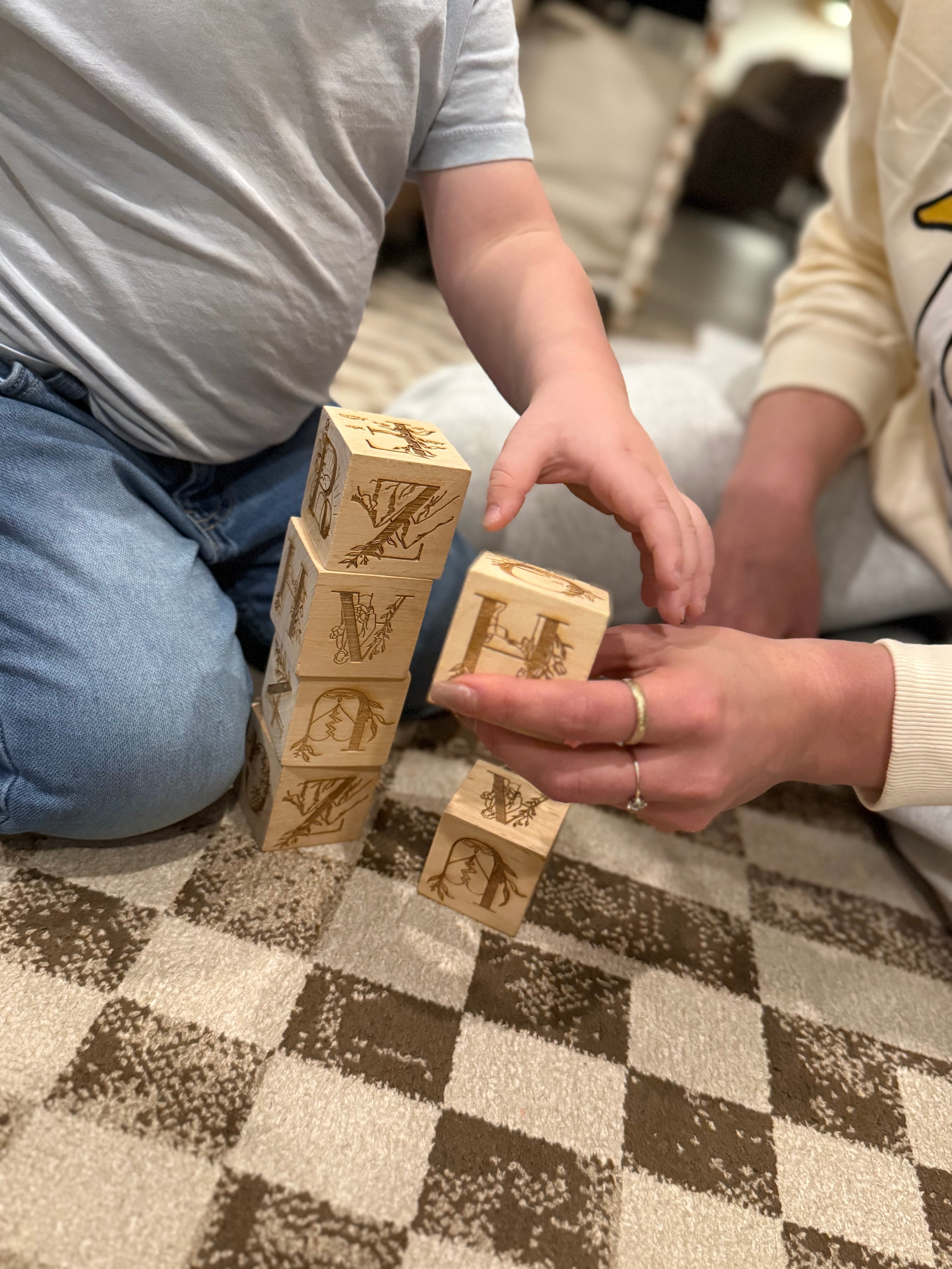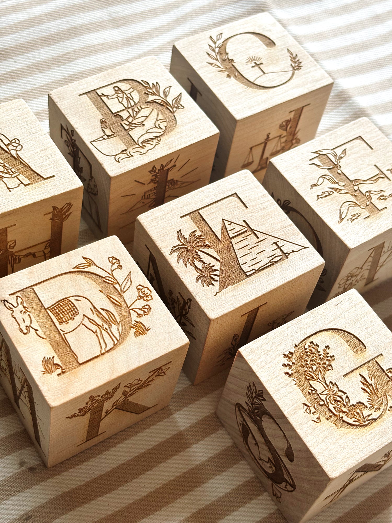 Wooden biblical alphabet blocks built to bring the love of Christ into playtime, schooling, and everyday activities.